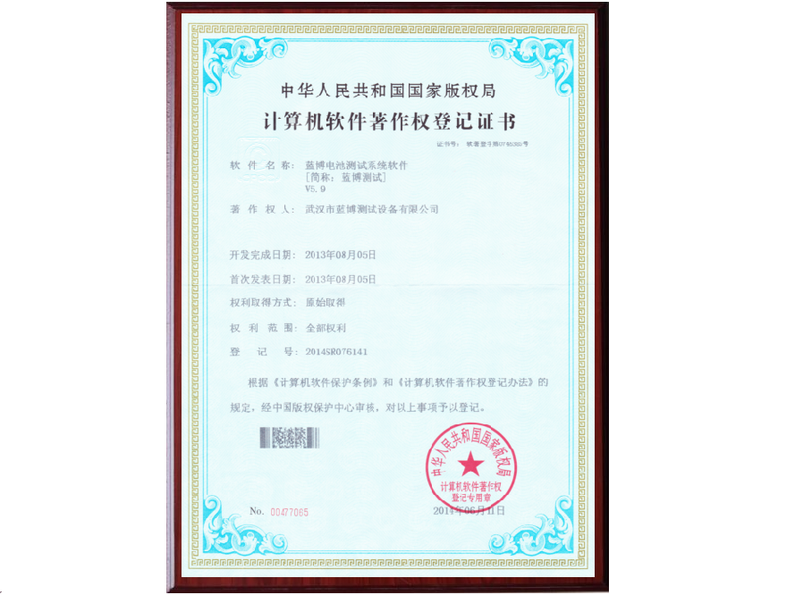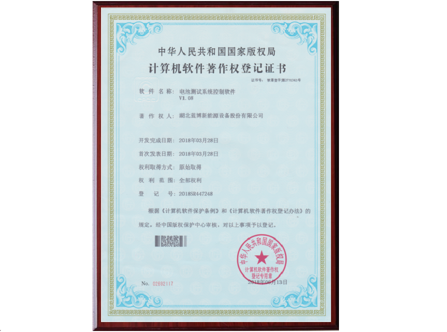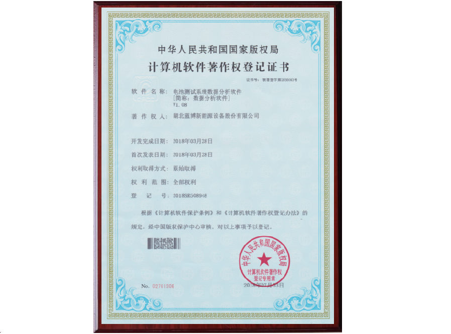 根據(jù)《計(jì)算機(jī)軟件保護(hù)條例》和《計(jì)算機(jī)軟件著作權(quán)登記辦法》的規(guī)定,經(jīng)中國版權(quán)保護(hù)中心審核,中華人民共和國國家版權(quán)局對(duì)藍(lán)博公司提交的電池測試系統(tǒng)軟件著作權(quán)認(rèn)定為原始取得并予以登記,從頒證之日起,這套電池測試系統(tǒng)軟件的版權(quán)將得到中國版權(quán)保護(hù)中心的有效保護(hù)。